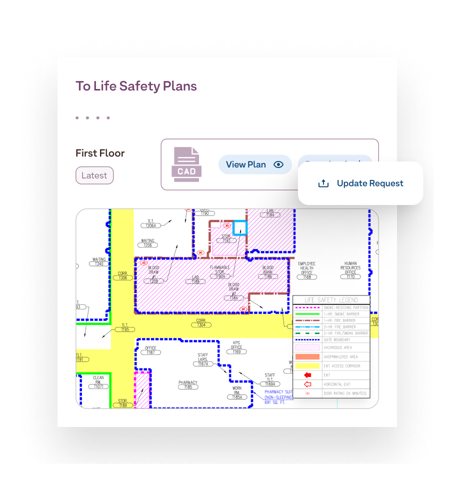 - Life safety drawing support: Ensures all facility maps meet code and inspection standards.