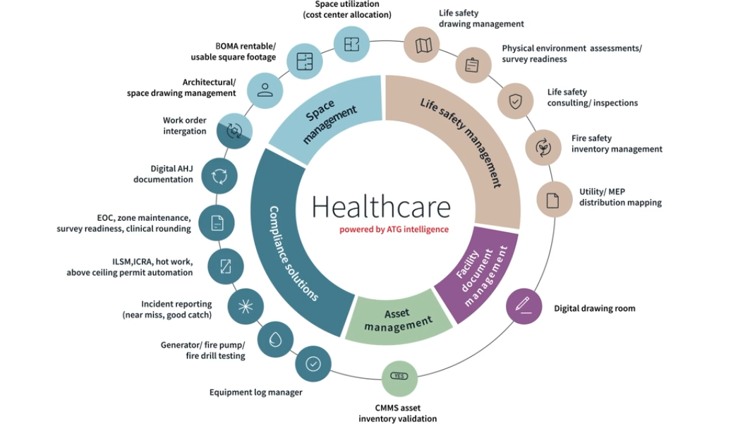 Acquired by JLL, ATG delivers facility compliance and asset data solutions for healthcare. It focuses on helping hospitals maintain accurate records, meet regulatory requirements, and prepare for inspections through structured data management. The tool is best known for its expertise in facility documentation, life safety drawings, and asset validation.