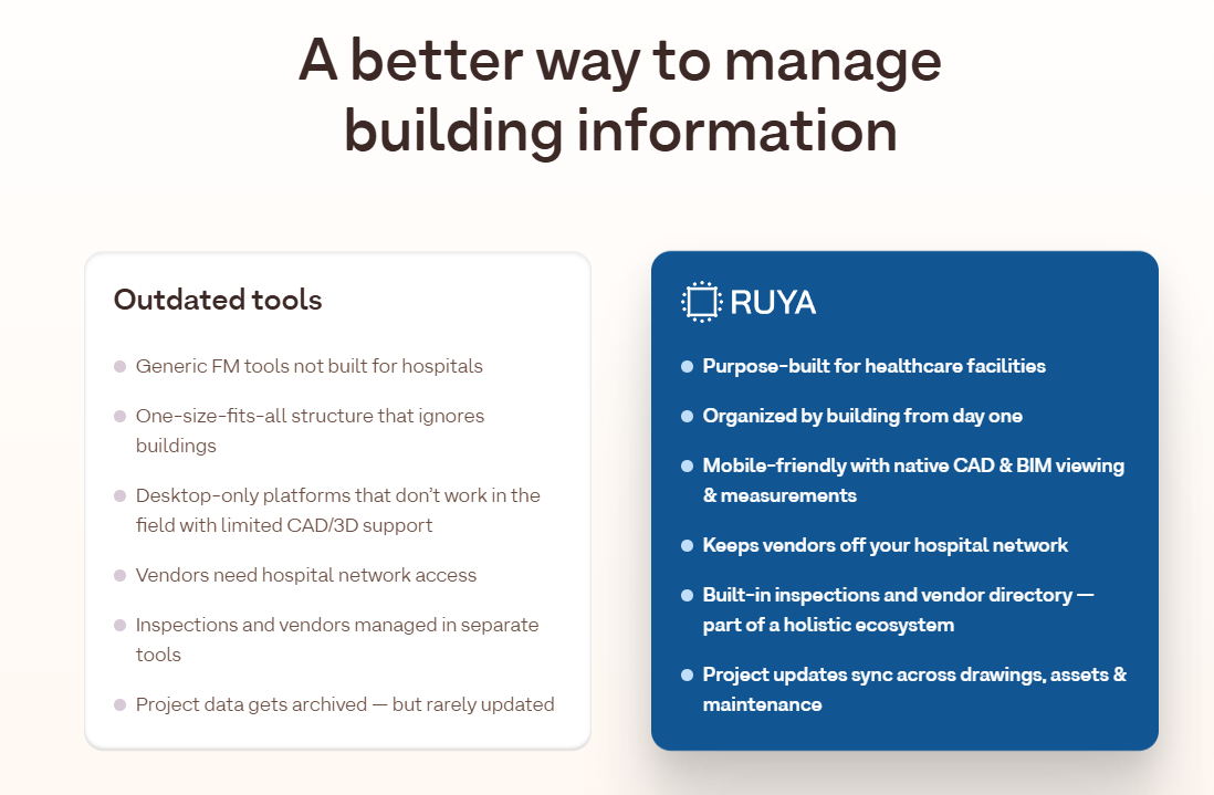 At Ruya, we understand the day-to-day pain of finding, updating, and securing critical files across large healthcare facilities.