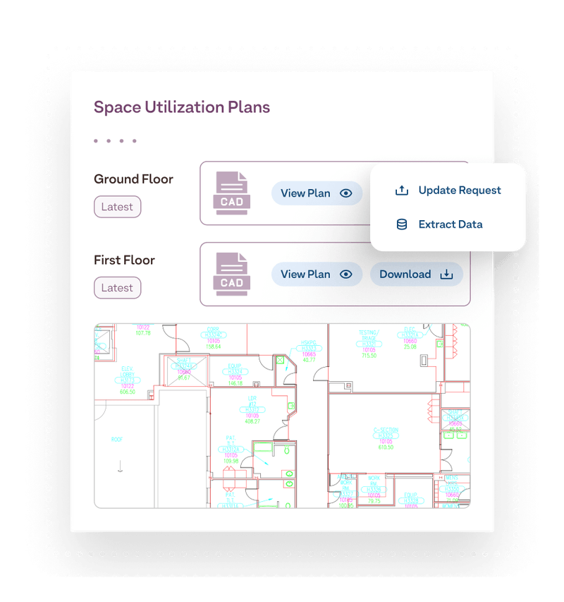 - Real-time, centralized access: View and update floor plans (PDF, DWG, Revit formats), vendor details, and asset records on the go, ensuring always up-to-date information.